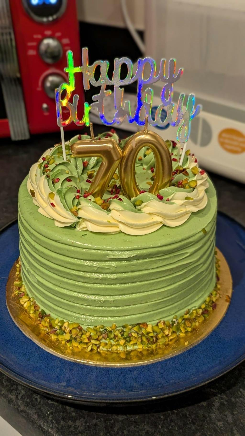 Ingredients: Plain Sponge ((Sugar, Wheat Flour (With Calcium, Iron, Niacin, Thiamin), Dried Whole Egg, Wheat Starch, Raising Agents, (E450 Vii), (E501 Ii), (E500 Ii), (E341 I), Emulsifiers (E475, E481, E475, E472b, E471, E481, E472e), Dried Egg White, Skimmed Milk Powder), Water, Rapeseed Oil (Rapeseed Oil, Anti Foaming Agent (E900)], E40 (Water, Vegetable Oil, Emulsifier (E476), Thickener (E903), Pistachio (Nuts) Custard Cream (Milk) (Water, Creme Patisserie (Sugar, Modified Starch: Skimmed Milk Powder, Lactose (Milk) Milk Proteins, Coconut Oil, Gelling Agent: Sodium Phosphates, Diphosphates, Sodium Alginate, Calcium Sulphate, Firming Agent: Calcium Sulphate: Flavouring, (CONTAINS Milk) Colour (Carotenes), Pistachio (Nuts) Filling (Vegetable Fat (Palm, Sunflower), Sugar, Lactose (Milk), (Pistachios) (Nuts) (18%), Modified Starch, Skimmed Milk Powder, Emulsifier Soya Lecithin, Flavours, Antioxidant: Rosemary Extract), Sweetened Whipped Cream (Milk) (Pasteurised Whipping Cream (Milk), Cream Stabiliser (Sugar, Modified Maize Starch, Stabilisers (E450, E401)), Pistachio (Nuts) Compound (Glucose Fructose Syrup, Sugar, Pistachio (Nuts) 15 %, Water, Colouring Foods (Stinging Nettle Concentrate, Spinach Concentrate), Natural Flavouring)), Nuts (Nibbed Pistachio)), Raspberry Cream (Sweetened Whipped Cream (Milk) (Pasteurised Whipping Cream (Milk), Cream Stabiliser (Sugar, Modified Maize Starch, Stabilisers (E450, E401)), Raspberry Compound (Natural Flavouring Substances, Flavouring Preparation, Sugar, Raspberries, Glucose Fructose Syrup, Colouring Food (Concentrate), Citric Acid, Acidity Regulator (E331iii) (E1422 Maize))), Pistachio (Nuts) Green Buttercream (Plain Swiss Buttercream (Sugar, Butter (Milk), Free Range Pasteurised Egg White, Margarine (Vegetable And Hydrogenated Vegetable Oil), Water, Salt, Emulsifier (E475), Flavourings, Colours (E160b, E100), Vanilla Mauritius (Flavouring (Water, (E1520), Caramel Sugar Syrup, Thickener (E415), Acidity Regulator (Citric Acid), Preservative (E202), (E442)), Pistachio (Nuts) Filling (Vegetable Fat (Palm, Sunflower), Sugar, Lactose (Milk), Nuts (Pistachios) (18%), Modified Starch, Skimmed Milk Powder, Emulsifier Soya Lecithin, Flavours, Antioxidant: Rosemary Extract)), Green Colour (Glycerol: E422; Canola Oil; Colours: E129; Emulsifiers: E322, E433)), Nuts (Nibbed Pistachio), Freeze Dried Raspberry Crumb).