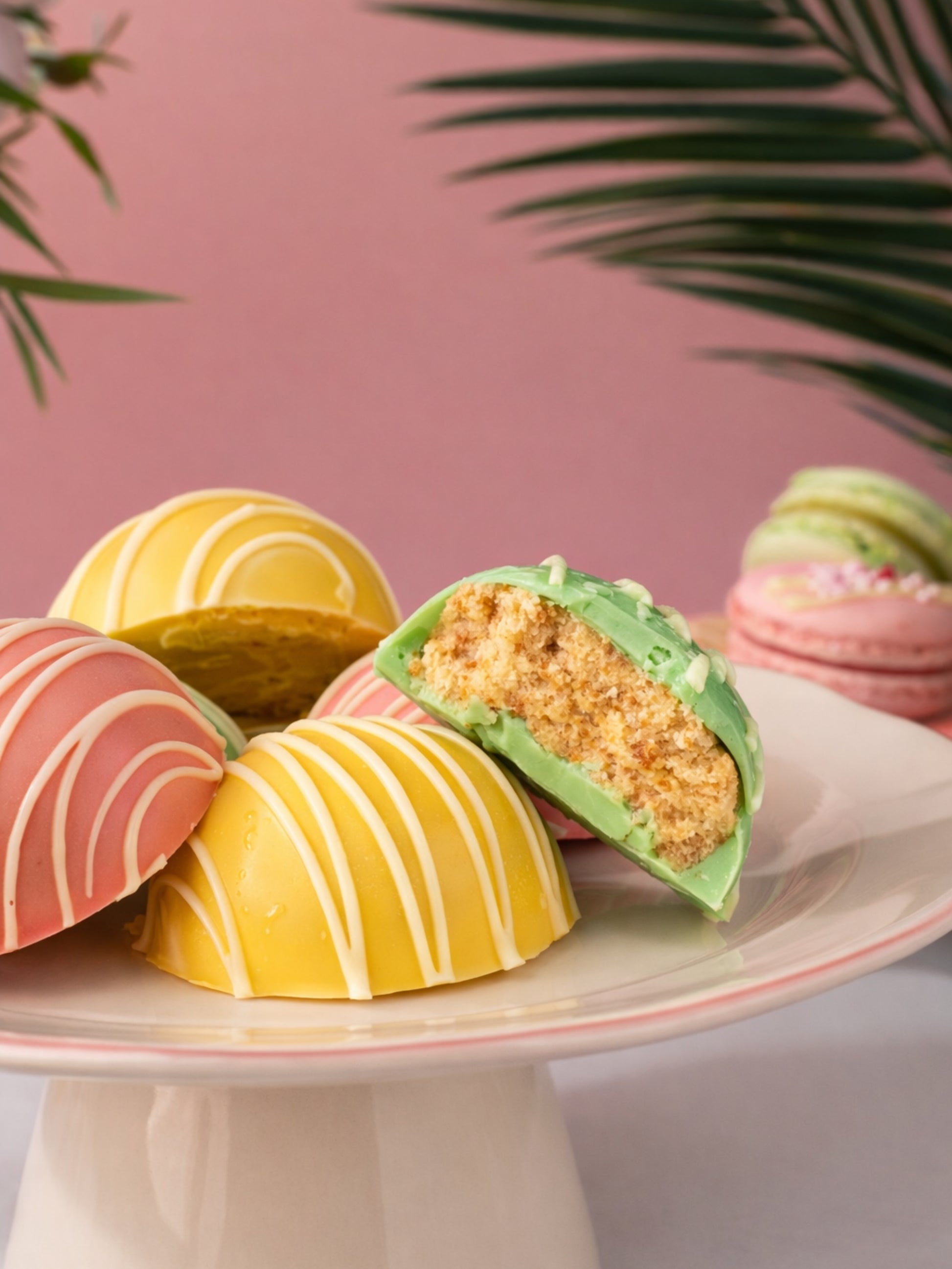 Raspberry Cake bite Coated with Pink-coloured white chocolate bite finished with a white chocolate drizzle.